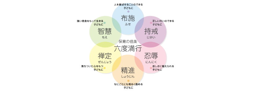 『六度満行』は三蔵法師が天竺から持ち帰った経典にゆらいします。そこに込められた思いは「人生の在り方」そのものであり、こどもたちがこれからの永い人生を❝正しく・強く・たくましく❞生きるために大切にしたい❝心❞です。